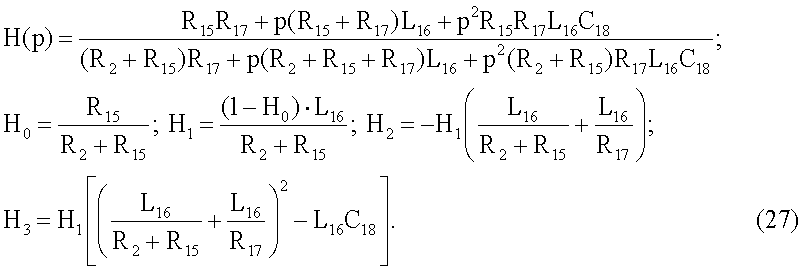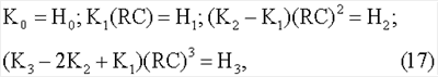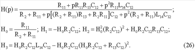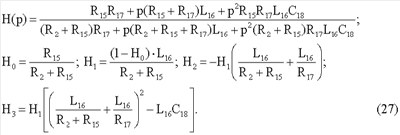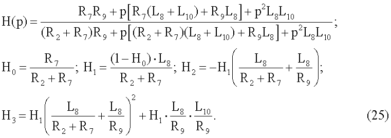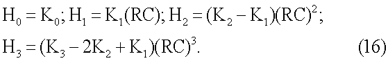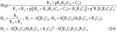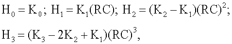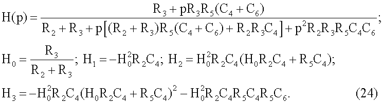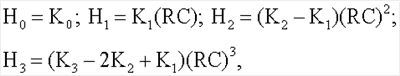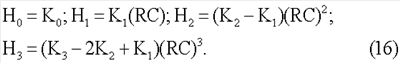 Ниже приводятся формулы передаточных функций цепей с каждым из четырехэлементных двухполюсников и выражения, которые связывают параметры цепей H0, H1 Н2 и Н3 с номинальными значениями компонентов двухполюсников.