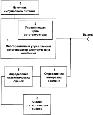 Действия с сигналом, которые отражены на функциональной схеме блоками 4 и 5, сами по себе не являются новыми и могут быть осуществлены с помощью известных устройств. Но то, что выбор интервала времени для определения и определение статистических оценок информативных параметров осуществляют по выходным колебаниям многорежимного управляемого автогенератора электрических колебаний в режиме холостого хода его работы (т.е. ненагруженного автогенератора) – это признаки, обладающие новизной.