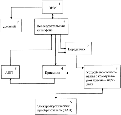 Затем, по команде «пуск», на второй вход передатчика 3 из ЭВМ 1 через последовательный интерфейс 2 поступает полезный сигнал, сформированный по параметрам, установленным по умолчанию, и, после усиления, через устройство согласования с коммутатором приема-передачи 8, он подается на электроакустический преобразователь 5. Одновременно коммутатор приема-передачи 8 отключает вход приемника 4 от ЭАП 5. Этим обеспечивается защита приемника 4 от высокого напряжения на входе в момент излучения.