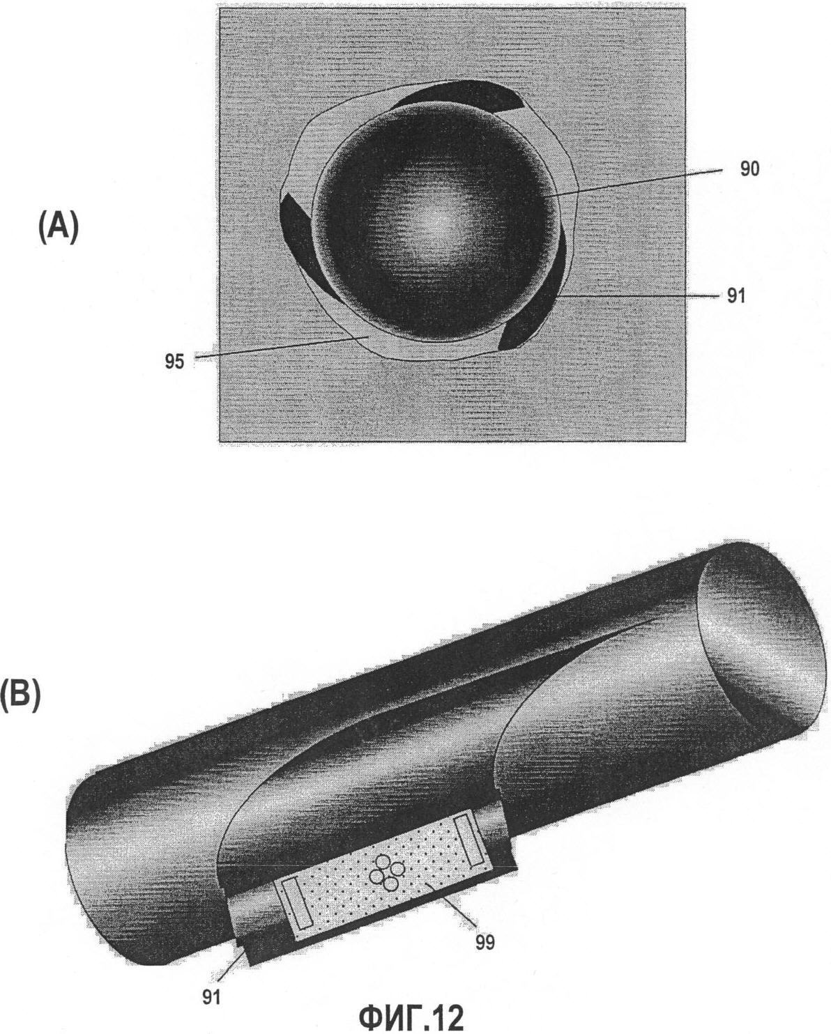 Один пример разворачиваемого опорного элемента можно найти в устройстве PowerDrive , недавно представленного компанией Schlumberger Technology Corporation (г.Хьюстон, Техас, США). Устройства PowerDrive включают в себя опорные элементы с гидравлическим управлением, которые могут быть использованы для управления буровой головкой посредством механизма толкания головки. На Фиг.12А показан поперечный разрез муфты, оснащенной тремя опорными элементами 91 PowerDrive , расположенной на устройстве 90 PowerDrive , который находится в процессе бурения скважины 95. Разворачиваемые опорные элементы на устройстве PowerDrive могут быть использованы для размещения датчиков, предназначенных для измерения свойств формации. Например, на Фиг.12В показан датчик согласно одному варианту осуществления изобретения, размещенный на одном из опорных элементов PowerDrive .