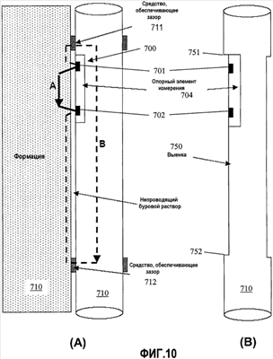 На Фиг.10В показан вариант осуществления изобретения, альтернативный варианту, показанному на Фиг.10А. Как показано на Фиг.10В, в корпусе 710 устройство для каротажа предусмотрена выемка, так что опорный элемент 704 вместе с электродами не будет напрямую контактировать со стенкой ствола скважины. Когда это устройство для каротажа прижимается к стенке ствола скважины, между опорным элементом 704 и стенкой ствола скважины будет оставаться слой непроводящего бурового раствора. Этот слой непроводящего бурового раствора будет обеспечивать изоляцию. Следовательно, только части корпуса устройства для каротажа, расположенные выше и ниже выемки, контактируют со стенкой ствола скважины, что обеспечивает заземление. Отметим, что расстояние между верхним краем 751 и нижним краем 752 выемки 750 должно быть большим по сравнению с длиной опорного элемента 704, с тем, чтобы минимизировать короткое замыкание требуемого тока (показанного на Фиг.10А как путь А). Специалист в данной области техники должен понимать, что возможны разновидности вариантов осуществления изобретения, показанных на Фиг.10А и 10В. Например, альтернативой варианту осуществления изобретения, показанному на Фиг.10В, является введение в выемку 750, показанную на Фиг.10В изолирующего материала.