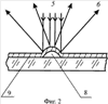 В исходном положении (фиг.1) на подложке 1 расположен мембранный тонкопленочный слой 2; смежные поверхности пленки и подложки совпадают, и наружная поверхность пленки повторяет поверхность подложки. На участке 7 размером а адгезия между пленкой и подложкой отсутствует; форма этого участка может быть круглой, квадратной, в виде полосы и т.д. Если на слой падает световой поток, он зеркально отражается, не изменяя своей структуры. На фиг.3 показан вариант устройства, в котором через проводящий слой 2 может быть пропущен электрический ток i с помощью электрических контактов 11. Импульсное нагревание слоя 2 (на фиг.2 и на фиг.4) приводит к тепловому расширению слоя в области, где отсутствует адгезия, и слой «выпучивается» наружу, как показано на фиг.2 и фиг.4, между пленкой и подложкой образуется полость 8. В остальных местах адгезия к подложке не дает слою деформироваться.