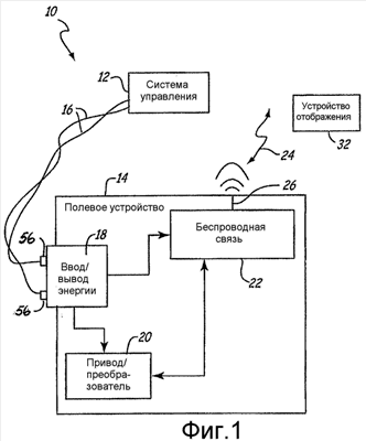Фиг.1 является упрощенной блок-схемой системы 10 управления технологическим процессом или текущего контроля, в которой пост управления или система 12 управления подсоединяется к полевому устройству 14 через двухпроводной контур 16 управления технологическим процессом. Полевое устройство 14 включает в себя электрическую схему 18 ввода/вывода энергии, привод/преобразователь 20 и электрическую схему (модуль) 22 беспроводной связи. Электрическая схема 22 беспроводной связи выполнена с возможностью посылать и/или принимать ВЧ сигнал 24, используя антенну 26.