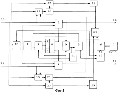 И-НЕ 12 (т.к. на его третьем входе имеется нулевой сигнал с выхода элемента ИЛИ 26), а по второму входу единичным сигналом с единичного выхода триггера 8. Таким образом, на выходе 16 устройства установится единичный сигнал с выхода элемента И 2. Этот же сигнал, поступив на вход установки в единичное состояние триггера 8, обеспечит удержание в единичном состоянии триггера 8, а через элементы ИЛИ 9 и НЕ 11 закроет элемент И 4 по второму входу, прекратив этим подачу импульсов с генератора 1 на счетный вход триггера 8.
