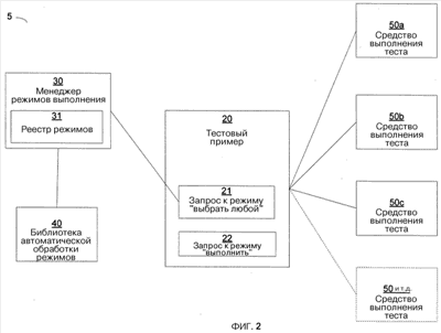 Тестовый пример 20 может включать в себя запрос к режиму 21 «выбрать любой», который запрашивает менеджера режимов выполнения выбрать режим из библиотеки 40 автоматической обработки режимов. Тестовый пример 20 может также включать в себя запрос к режиму 22 «выполнить», который инициирует выполнение режима «выполнить», хранящегося в библиотеке 40 автоматической обработки режимов.