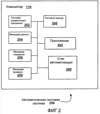 Автоматизированная тестовая система 250 может постоянно находиться на одном или более компьютерах типа примерного компьютера 110, описанного по отношению к фиг.1. Автоматизированная тестовая система 250 может включать одну или более: тестовую управляющую программу 252, менеджер данных 254, менеджер поведения 256 и связанный банк данных поведений (не показанный здесь), менеджер проверки 258 и стек 200 автоматизации. Тестовая управляющая программа 252 может выполнить тестовый пример 260 для приложения 262. Менеджер данных 252 в некоторых вариантах воплощения изобретения может предоставить тестовые данные, требуемые тестовым примером 260. Менеджер данных может предоставить доступ к централизованному хранилищу всех тестовых данных и позволить производить изменения в тестовых данных способом, при котором тестовые данные генерируются, требуя минимального или не требуя никаких изменений в тестовых примерах.