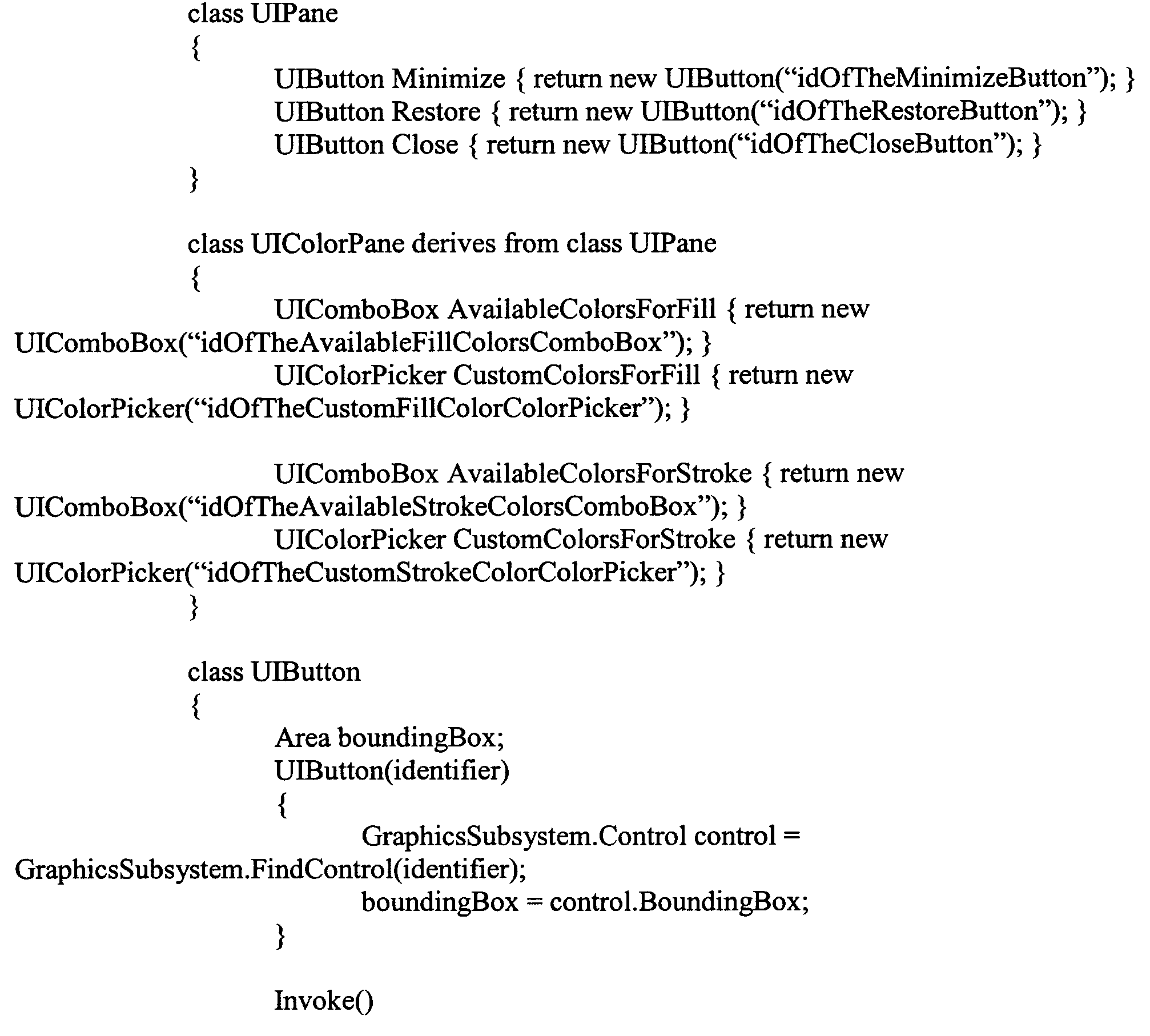 Библиотека 200 автоматизации может включать компоновку и управляющие элементы графической подсистемы 228 анимации. Компоновочная часть библиотеки 200 автоматизации может включать классы для каждого образца визуального элемента графической подсистемы 228 анимации. Таким образом, компоновочная часть может включать все классы, которые представляют визуальные элементы «верхнего уровня» графической подсистемы 228, такой как, но не ограниченной этой: диалог нового проекта, одну или более панелей инструментов и главное меню. Часть управляющих элементов может включать классы для каждого типа визуального элемента. То есть часть управляющих элементов может включать классы для всей системы и заказного управляющего элемента, используемого с графической подсистемой анимации, такие как, но не ограниченные этим: класс кнопки, класс поля со списком, класс текстового поля и класс выбора цвета. Этот управляющий элемент может быть доступен только через элементы верхнего уровня (например, через главное меню, область панели инструментов или диалог нового проекта). Каждый управляющий элемент в части управляющих элементов библиотеки 200 автоматизации может включать все методы и свойства, требуемые для обращения и управления элементом, включая реализации для всех способов ввода (например, через клавиатуру, мышь, программное обеспечение для людей с ограниченными возможностями и т.д.).