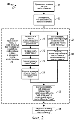 На Фиг. 2 показана блок-схема способа 200 генерации web-страницы из определения web-страницы таким образом, что к web-странице применяется тема без свойств, ассоциированных с темой, включаемых в определение web-страницы. На Фиг. 3 проиллюстрирована последовательность 300 обработки структур данных. Последовательность 300 обработки структур данных, соответствующая Фиг. 3, описана со ссылками на способ 200 по Фиг. 2.