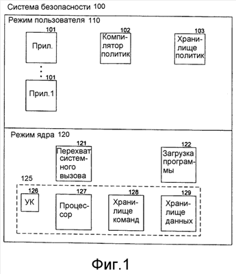 На фиг. 1 изображена блок-схема, которая иллюстрирует компоненты системы безопасности согласно одному варианту осуществления. Система безопасности включает в себя некоторые компоненты, которые исполняются в режиме 100 пользователя, и другие, которые исполняются в режиме 120 ядра. Компилятор 102 политик – это компонент, который исполняется в режиме пользователя для компиляции политик безопасности из хранилища 103 политик в программы безопасности, исполняемые виртуальной машиной безопасности. Компоненты режима ядра включают в себя компонент 121 перехвата системного вызова, компонент 122 загрузки программы и виртуальную машину 125 безопасности. Виртуальная машина безопасности включает в себя указатель 126 команды (УК), средство 127 обработки, хранилище 128 команд и хранилище 129 данных. Компонент загрузки программы загружает программы безопасности, скомпилированные компилятором политик, в хранилище команд виртуальной машины безопасности, сохраняет программные данные в хранилище данных и задает начальный указатель команды. Компонент перехвата системного вызова перехватывает системные вызовы, выданные прикладными программами 101, и сохраняет параметры каждого системного вызова и информацию управления процессом прикладных программ в хранилище данных. После перехвата системного вызова и сохранения его параметров компонент перехвата системного вызова предписывает средству обработки исполнять программу безопасности из хранилища команд. Процессор исполняет программу безопасности, извлекая команды, на которые указывает указатель команды, и осуществляет операции, заданные командами. Операции включают в себя сохранение действий, которые следует предпринимать для воплощения политики безопасности, в выходном наборе действий хранилища данных. По завершении исполнения программы безопасности компонент перехвата системного вызова осуществляет действия выходного набора действий.