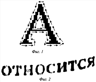 Сущность предлагаемого изобретения по п.1 формулы состоит в том, что изображения знаков, находящихся на бумаге, сканируют или фотографируют и полученное цифровое растровое изображение подвергают обработке. Выделяют строки знаков и/или отдельно стоящие знаки. В случае выделения строки печатных знаков ее разбивают на равные по своим параметрам знакоместа. Выделяют границы каждого знакоместа распознаваемого знака. Далее выделяют горизонтальные (верхнюю и нижнюю) и вертикальные (правую и левую) границы одного знакоместа, анализируя значения изменения яркостных характеристик элементов растрового изображения. Затем выделяют точку начала обхода, в качестве которой можно использовать, например, крайнюю верхнюю правую точку изображения символа, точку пересечения линий изображения символа, либо другую точку. Далее выполняют обход внешнего контура изображения знака с постоянной скоростью, например, против часовой стрелки. Далее находят число внутренних полостей изображения знака, анализируя значения изменений яркостных характеристик изображения символа. Затем для каждой найденной полости выделяют точку начала обхода по заранее заданному правилу и затем выполняют с постоянной скоростью обход каждой внутренней полости изображения символа.