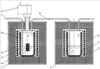 Сначала в тигли 4 печей 1 и 2 загружают смеси карбонатов щелочных металлов: в тигель 4 печи 1 смесь карбонатов щелочных металлов с температурой плавления не выше 900°С и окислитель в виде оксида свинца, а в тигель 4 печи 2 смесь карбонатов щелочных металлов с температурой плавления не выше 550°С. Тигли 4 с помощью электронагревателей 5 разогревают до рабочих температур.