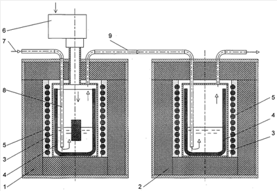 Оставшиеся от процесса дожигания газы собираются над расплавом и через трубку 9 подаются на газоочистительные фильтры (условно не показаны).