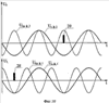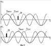 Эти результаты поясняются диаграммами, приведенными на фиг.9, на которых показано распределение в двухзазорном выходном резонаторе СВЧ-напряжений противофазного вида колебаний Uпр.ф.1 и Uпр.ф.2 с частотой и синфазного вида колебаний Uс.ф.1 и Uс.ф.2 с частотой 2 соответственно в первом и втором ВЧ зазорах в зависимости от времени t, а также показано положение электронного сгустка 20. Из указанных временных диаграмм видно, что в обоих ВЧ зазорах электронные сгустки всегда попадают в тормозящую фазу электрического СВЧ-поля.
