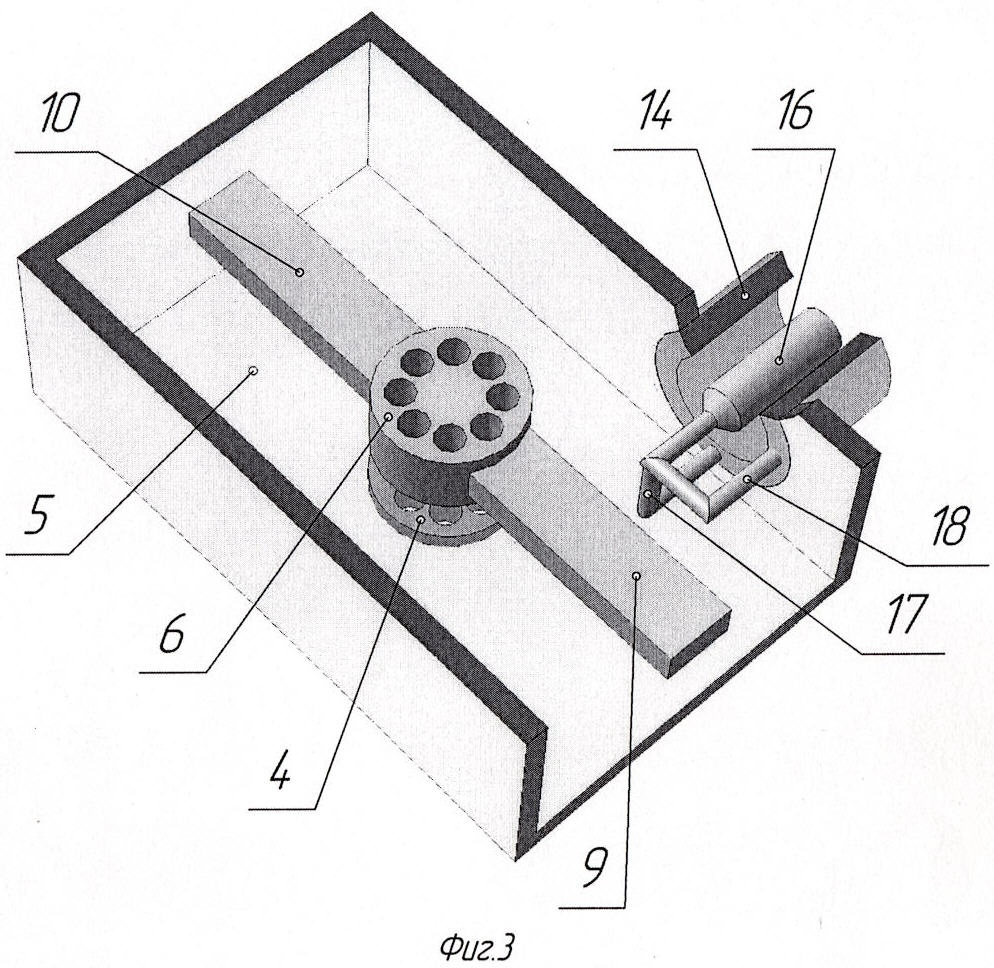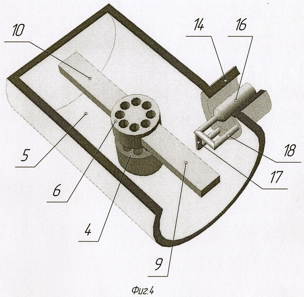 Конструкция двухзазорного коаксиального выходного резонатора 5 для СВЧ-прибора, изображенного на фиг.1, показана на фиг.2. Плоскость второй петли связи 18, предназначенной для отвода мощности на частоте , перпендикулярна продольной оси СВЧ-прибора, а плоскость первой петли связи 17, предназначенной для отвода мощности на частоте 2 , параллельна продольной оси СВЧ-прибора. Коаксиальная линия 13 вывода СВЧ-энергии установлена перпендикулярно боковой стенке 15 выходного резонатора 5, при этом расстояние Z от оси центрального проводника 16 коаксиальной линии 13 вывода СВЧ-энергии до ближайшей торцевой стенки 7 выходного резонатора 4 составляет Z=0,25 Н, где H – расстояние между торцевыми стенками 7, 8 выходного резонатора 5. При таком расположении петель связи 17, 18 в выходном резонаторе 5 достигаются одинаковые значения мощностей на частотах и 2 , которые из выходного резонатора 5 поступают в коаксиальную линию 13 вывода СВЧ-энергии. Аксонометрическая проекция двухзазорного коаксиального выходного резонатора 5, изображенного на фиг.2, показана на фиг.3.