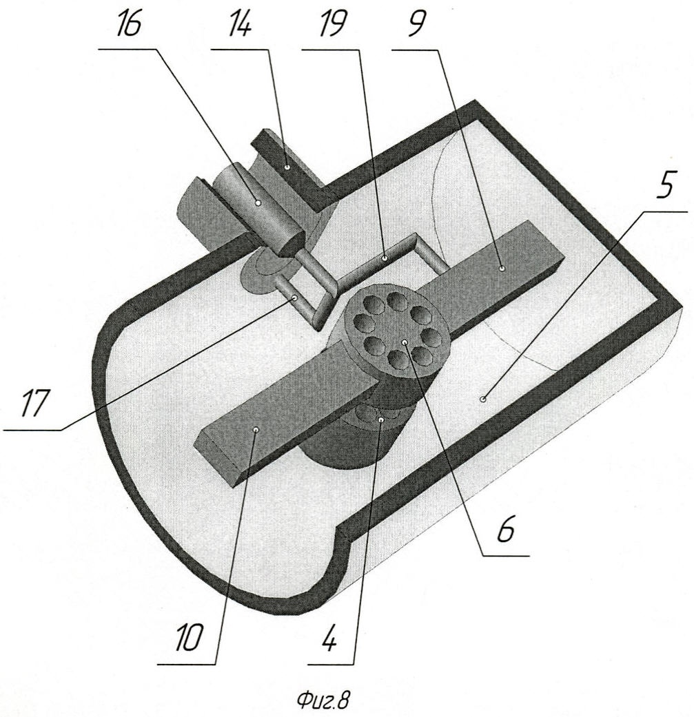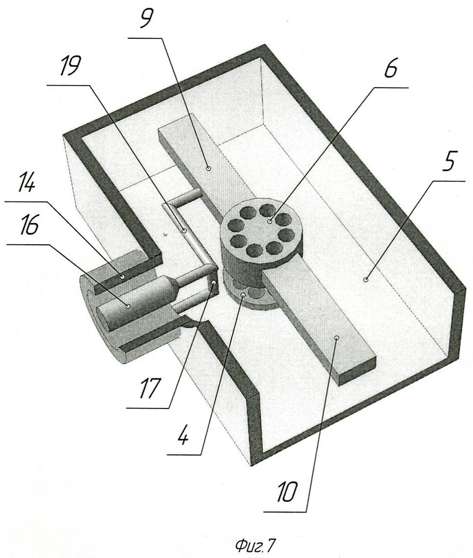 Конструкция двухзазорного коаксиального выходного резонатора 5 для СВЧ-прибора, изображенного на фиг.5, показана на фиг.6. Плоскость петли связи 17, предназначенной для отвода мощности на частоте 2 , параллельна продольной оси СВЧ-прибора и перпендикулярна ( =90°) торцевым поверхностям пролетных труб 4 и 6. Коаксиальная линия 13 вывода СВЧ-энергии установлена перпендикулярно боковой стенке 15 выходного резонатора 5, при этом ось коаксиальной линии 13 расположена в средней плоскости продольного сечения выходного резонатора 5, перпендикулярной продольной оси СВЧ-прибора, равноудаленно от торцевых стенок 7, 8 выходного резонатора 5, при этом расстояние от места соединения дополнительного проводника 19 с проводящим держателем 9 до торцевой стенки 7 выходного резонатора 5 составляет X=0,5 L, где L – расстояние от продольной оси СВЧ-прибора до расположенной со стороны проводящего держателя торцевой стенки 7 выходного резонатора 5.