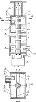 При таком расположении петли связи 17 и дополнительного проводника 19 в выходном резонаторе 5 достигается максимальное значение мощности, поступающей в коаксиальную линию 13 вывода СВЧ-энергии из выходного резонатора 5. Аксонометрическая проекция двухзазорного коаксиального выходного резонатора 5, изображенного на фиг.6, показана на фиг.7.