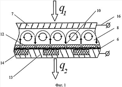 Рабочий процесс осуществляют подводом тепла к катоду 7 от средств его обогрева (например, излучением и конвекцией от горящей газовоздушной смеси в камере печи) с прогревом его до температуры в диапазоне 1100-1300°C в условиях отвода тепла от анода 12 средствами его охлаждения (например, тепловой трубой или термосифоном) при температуре 250-500°C. В указанном температурном режиме устанавливается пятнистая структура поля температуры капиллярно-пористой прокладки 6 – под отверстиями 10 в перфорированном аноде 12 с теплоизолирующими прокладками 14 температура выше, чем под отверстиями 10 без теплоизолирующих прокладок 14. В результате происходит интенсивное испарение расплава цезия из капиллярно-пористой прокладки 6 и поступление его пара через отверстия 10 в перфорированном аноде 12 над теплоизолирующими прокладками 14 в межэлектродный зазор 8 и конденсация пара цезия, поступающего из межэлектродного зазора 8 через отверстия 10 перфорированного анода 12, размещенные вне теплоизолирующих прокладок 14, на капиллярно-пористой прокладке 6. За счет капиллярных сил конденсат цезия перетекает по капиллярно-пористой прокладке 6 от отверстий 10 в перфорированном аноде 12 без теплоизолирующих прокладок 14 к отверстиям 10 в перфорированном аноде 12 с теплоизолирующими прокладками 14. В межэлектродном зазоре 8 образуется система разнонаправленных потоков пара цезия, формирующая конвективные микроциркуляционные ячейки. Критерием устойчивого формирования микроциркуляционных ячеек является отношение шага между отверстиями 10 перфорированного анода 12 с противоположными направлениями течения пара цезия к толщине межэлектродного зазора 8. При отношении указанных размеров в диапазоне 0,7-1,4 формируются конвективные микроциркуляционные ячейки первого порядка (одна вихревая зона, показана на фиг.1), при отношении в диапазоне 2,5-4,0 – второго порядка (три вихревые зоны). При увеличении порядка микроциркуляционных ячеек скорость пара цезия быстро падает вследствие диссипативных процессов, поэтому их использование нецелесообразно.