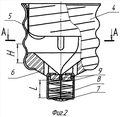 На фиг.2 изображен цоколь 4, состоящий из корпуса с резьбой 5, изолятора 6, контактной пластины 7, пружины сжатия 8, размещенной между изолятором и контактной пластиной. Ограничитель 9 в данном примере состоит их 2-х лепестков, закрепленных на контактной пластине и отогнутых на наружной поверхности изолятора 6. В цоколе размещена сформованная часть горла с отходящими проволочными вводами токовыми, которые припаяны к контактной пластине 7 и к корпусу цоколя 5. Расстояние между контактной пластиной и изолятором обозначено L.