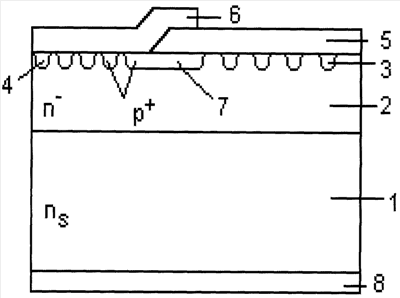 Высоколегированная подложка 1 выполнена из карбида кремния n-типа, на ее верхней стороне расположен эпитаксиальный слой 2 из карбида кремния n-типа. В этом слое расположены выполненные из бора с определенной глубиной залегания подконтактная p-n структура 4 (состоящая из нескольких p-n переходов), интегрированная с никелевым контактом Шоттки 6, и охранная структура, состоящая из основного охранного p-n перехода 7 и плавающих охранных колец 3 в виде p-n переходов, слой 5 оксида кремния расположен над охранной структурой, а никелевый омический контакт 8 – на обратной стороне подложки 1.