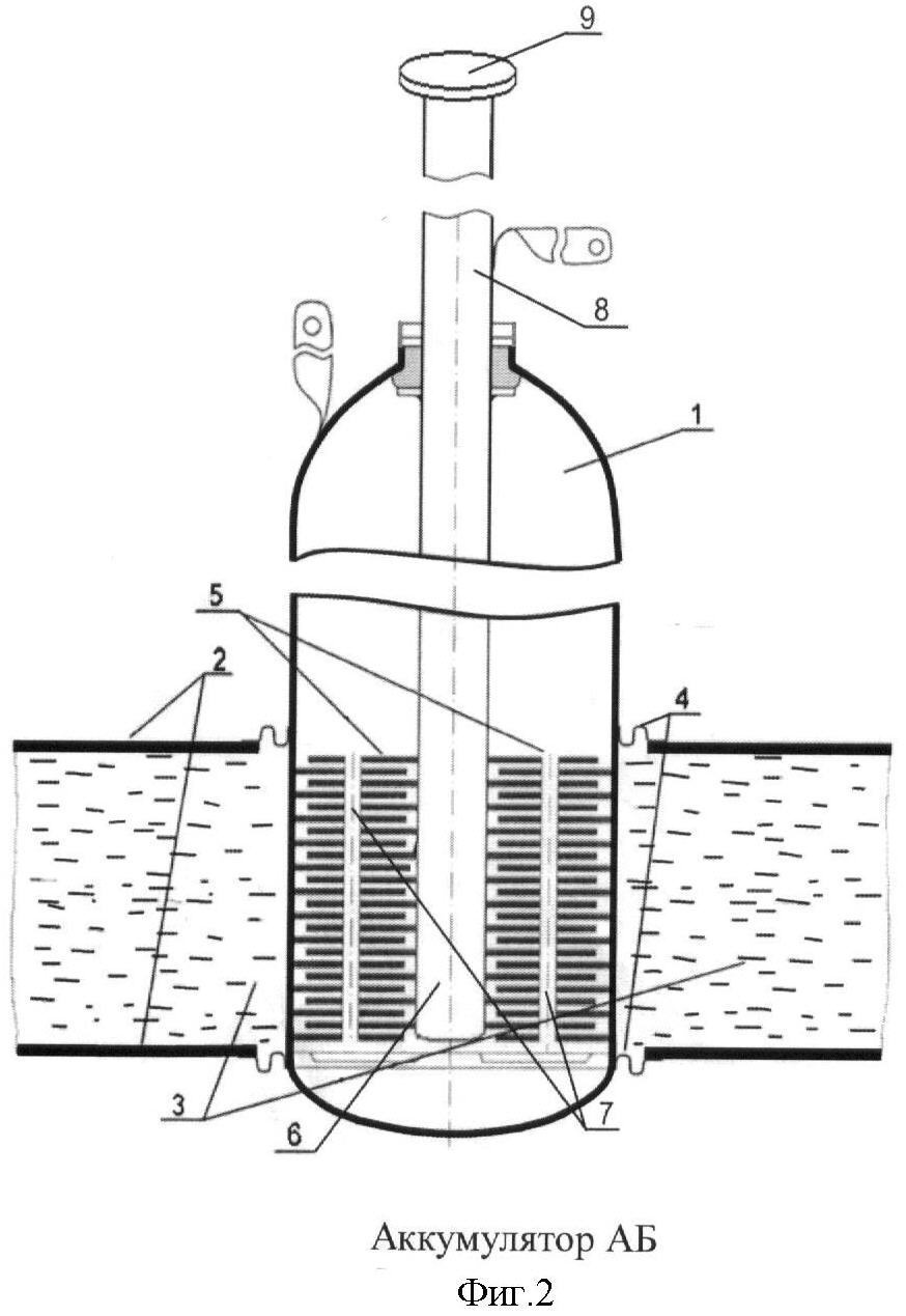Описываемая батарея (см. фиг.1) состоит из п аккумуляторов 1, соединенных последовательно, установленных в отверстиях по количеству аккумуляторов теплопроводной плиты, выполненной в виде неэлектропроводных пластин 2 и неэлектропроводного энергоемкого вещества 3 между ними (см. фиг.2), оси аккумуляторов 1 перпендикулярны поверхностям пластин 2, в которых аккумуляторы 1 закреплены через мембраны 4 так, что боковые цилиндрические поверхности электродных блоков 5 аккумуляторов 1 расположены напротив слоя неэлектропроводного энергоемкого вещества 3 для обеспечения теплового контакта с внешними поверхностями корпусов аккумуляторов 1, которые находятся в тепловом электрическом контакте с электродами одной полярности электродных блоков 5. Через центральные области электродных блоков 5 проходят испарительные концы 6 тепловых труб, которые находятся в тепловом и электрическом контакте с электродами другой полярности электродных блоков 5. В электродах обоих полярностей выполнены отверстия 7 с суммарным сечением, достаточным для выравнивания давления водорода, выделяемого-поглощаемого электродными блоками 5, по всем внутренним объемам аккумуляторов 1, а электрически изолированные от корпусов аккумуляторов 1 корпуса 8 тепловых труб являются одновременно борнами. Конденсаторные концы 9 тепловых труб находятся в тепловом контакте с радиационным теплообменником (на фиг.2 не показан, поскольку относится к СТР, а точнее – термостабилизации).