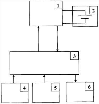 В блоке режимов тестирования 4 устанавливается режим тестирования для данного аккумулятора. Режим определяет диапазон частот, в котором будет тестироваться аккумулятор. Этот диапазон зависит от емкости аккумулятора, типа электродов и определяется на базе экспериментальных данных для аккумуляторов различного типа так, чтобы минимальное комплексное сопротивление находилось в данном диапазоне. В соответствии с выбранным режимом блок управления и анализа 3 изменяет частоту генератора 1 в диапазоне от 10 до 4000 Гц и амплитудным значением 5 мВ. Синусоидальный ток, идущий через аккумулятор 2, и напряжение поляризации аккумулятора с генератора 1 подаются на блок управления и анализа 3, который вычисляет значение импеданса при каждом измерении и находит среди всех значений минимальное. Полученное минимальное значение является омическим сопротивлением аккумулятора. Чем ниже внутреннее омическое сопротивление аккумулятора, тем сильнее развиты дендриты внутри сепаратора и тем больше аккумулятор предрасположен к тепловому разгону. Далее блок управления и анализа 3 вычисляет коэффициент предрасположенности аккумулятора к тепловому разгону =( 0– )/ 0*100%, где 0 – внутреннее омическое сопротивление данного аккумулятора в начале эксплуатации, которое он берет из блока памяти 5 в соответствии с его инвентарным номером, – внутреннее омическое сопротивление аккумулятора на момент проверки, которое вычислено блоком управления и анализа 3. Полученный результат выводится в блок индикации 6. Значение >20% свидетельствует о значительном развитии дендритов внутри сепаратора, следовательно, аккумулятор предрасположен к тепловому разгону.