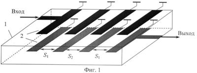 Заявляемое устройство (Фиг.1) содержит диэлектрическую подложку 1, подвешенную между двумя экранами, на обе поверхности которой нанесены полосковые металлические проводники 2, соединенные с одного конца с экраном и электромагнитно связанные между собой. Пара полосковых проводников, располагающихся на разных поверхностях подложки, образует полосковый резонатор, причем проводники резонатора могут быть, например, прямоугольными идентичными по форме и располагаться строго друг над другом.