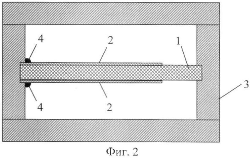 На Фиг.2 изображен разрез конструкции вдоль полосковых проводников, поясняющий способ крепления подложки. Здесь 1 – подложка, 2 – полосковые проводники, 3 – стенки корпуса с пазами для крепления подложки, 4 – пайка.