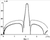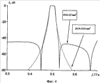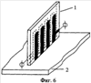 На фиг.5 приведена АЧХ фильтра без экранирующего корпуса (точки). Видно, что корпус оказывает незначительное влияние на положение и ширину полосы пропускания, однако без него затухание в полосах заграждения существенно больше. Слабое влияние экрана на АЧХ вблизи полосы пропускания говорит о более высокой концентрации электромагнитного поля внутри резонаторов фильтра, по сравнению с полосковыми резонаторами других конструкций. Это позволяет в некоторых случаях отказаться от экранирования фильтра и использовать его в качестве дискретного элемента гибридных интегральных схем СВЧ (Фиг.6). При этом сам фильтр 1 может устанавливаться вертикально относительно металлического основания схемы 2, что значительно уменьшает занимаемую им площадь.