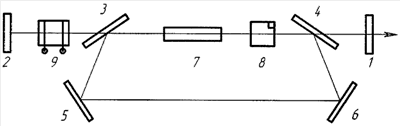 Резонатор лазера образован частично прозрачным зеркалом 1, глухим зеркалом 2, двумя поляризаторами – пластинами с диэлектрическим покрытием 3, 4 и двумя поворотными зеркалами 5, 6. Рядом с активным элементом из оптически изотропного кристалла 7 расположен 90-градусный вращатель плоскости поляризации излучения из оптически активного кристаллического кварца 8. Электрооптический элемент 9 вместе с глухим зеркалом 2 и поляризатором 3 образуют электрооптический затвор по схеме « /4».