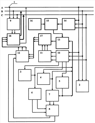 С выхода блока 8 сформированные сигналы поступают на вторую группу входов сумматора 12, на первую группу которого поступают сигналы с выхода блока 17. В общем случае, в блоке 12 происходит пофазное суммирование соответствующих пар сигналов, поступающих на его различные группы входов и относящихся к соответствующим фазам сигналов. При этом отсутствие одного из сигналов группы в соответствующей паре равносильно его равенству нулю. Таким образом, на выходе блока 12 формируются три сигнала управления дополнительным источником мощности 9. Первый из них состоит из пары сигналов – сигнала, соответствующего фазе «А» и содержащего ряд высших гармонических составляющих, подлежащих компенсации и сдвинутых на 180 эл. град, по отношению к аналогичным гармоникам в основной n-фазной сети, и разностного сигнала, сформированного в блоке 16, посредством которого формируют и стабилизируют необходимый коэффициент мощности основной n-фазной системы. Два других сигнала – это сигналы, каждый из которых пропорционален сигналам компенсации, содержащих ряд высших гармоник, подлежащих компенсации в соответствующих фазах «В» и «С» и сдвинутых на 180 эл. град, по отношению к аналогичным гармоникам в основной n-фазной сети. С выхода блока 12 сформированные таким образом сигналы управления поступают на цепи управления токами соответствующих фаз дополнительного источника мощности 9, посредством которого подаются в симметрируемые фазы. В качестве дополнительного источника мощности может быть использована, например, система с двойным преобразованием энергии, включающая ШИМ-выпрямитель, ШИМ-инвертор и содержащая промежуточное звено постоянного тока. Если количество фаз в симметрируемой системе больше чем три, способ осуществляется аналогично, в основном, посредством количественного наращивания блоков, пропорционального количеству фаз. Питание дополнительного источника мощности 9 осуществляют от комбинации минимум двух фаз, выбор которых осуществляется в блоке формирования комбинации минимально нагруженных фаз 18, таким образом, чтобы уменьшить несимметрию в основной симметрируемой системе.