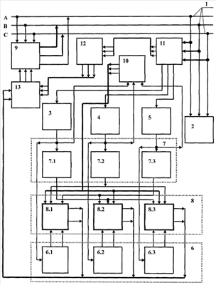 Предварительно, в зависимости от соотношения комплексов нагрузок, в качестве опорной выбирается одна из фаз – либо фаза с током нагрузки, близким к среднему, либо наименее нагруженная фаза, и в дальнейшем симметрирование осуществляется относительно выбранной фазы. Сигналы, пропорциональные несинусоидальным токам фаз, поступают в блок разделения сигналов 11, в котором из них выделяются две группы сигналов. В первую группу входят три сигнала, пропорциональные токам основных гармоник питающих фаз. Вторая группа содержит три сигнала, каждый из которых содержит спектр высших гармоник соответствующей фазы, подлежащих компенсации. В блоке 11 могут быть использованы селективные и полосовые фильтры. С выхода блока 11 первая группа сигналов поступает на датчик 3 формы опорной фазы и датчики 4 и 5 формы токов симметрируемых фаз. Одновременно вторая группа сигналов поступает на вход третьего фазосдвигающего блока 12, в котором каждый из трех сигналов инвертируется по фазе. С выхода блока 12 сигналы пропорциональные токам соответствующих фаз трехфазной системы, содержащие спектры высших гармоник, подлежащих компенсации, и сдвинутые по отношению к ним на 180 эл. градусов, поступают на первую группу входов сумматора 13. Далее, с выходов датчиков формы тока фаз 3, 4 и 5, сигналы, пропорциональные форме сигналов тока фаз n-фазной симметрируемой системы, поступают на группу информационных входов второго фазосдвигающего блока 7, состоящего из отдельных однотипных модулей, количество которых равно количеству фаз, и одновременно на информационные входы логического блока анализа заданной фазы 10 и на информационные входы первого фазосдвигающего блока 6. В блоке 10, посредством сравнения токов отдельных фаз, из них выбирается опорная фаза – либо фаза с током нагрузки, близким к среднему, либо наименее нагруженная фаза. Допустим, определили, что симметрирование будет происходить относительно наименее нагруженной фазы, т.е. фазы с минимальным током нагрузки. Путем анализа фаз, в блоке 10, выбирается наименее нагруженная фаза, определяется в качестве опорной, и на его выходе формируются управляющие сигналы запрета (разрешения) работы отдельных модулей логического блока формирования разностных сигналов 8, поступающие на группу управляющих входов последнего. Отсутствие сигналов запрета на отдельных выходах блока 10 равносильно присутствию на последних сигналов разрешения. Блоки 6, 7, участвующие в формировании сигнала на выходе блока 8, состоят из модулей, относящихся к какой-то определенной фазе. Так, например, модули 6.1 и 7.1 относятся к фазе «А», модули 6.2 и 7.2 – к фазе «В», модули 6.3 и 7.3 – к фазе «С». В блоке 7 сигналы, пропорциональные токам фаз «А», «В» и «С», сдвигаются на угол, равный 180 эл. градусам (инвертируются), по отношению к сигналам на выходах блоков 3, 4 и 5. Блок 6, в общем случае, состоит из n×2 фазосдвигающих цепочек – на каждую фазу по 2 (в каждый модуль входят по 2 фазосдвигающие цепочки). В работе постоянно задействованы только две из них, т.е. только один определенный модуль. Пара таких цепочек, или модуль, в который они входят, активируются в зависимости от того, какая из фаз выбирается в качестве опорной. Каждой парой фазосдвигающих цепочек сигнал, пропорциональный сигналу тока опорной фазы, в общем случае сдвигается соответственно на угол