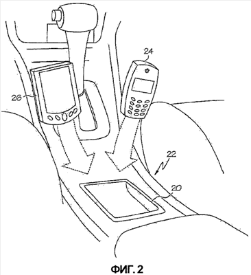 На Фиг.2 показан индуктивный автомобильный адаптер 20, установленный в кронштейне 22 автомобиля. Мобильный телефон 24 и КПК 26 могут быть размещены в индуктивном автомобильном адаптере 20 для подзарядки и связи с ADB 12.