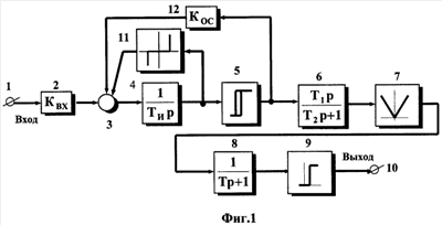 Звенья 2, 3, 4, 5, 12 в совокупности образуют автоколебательную систему с частотно-широтно-импульсной модуляцией. Амплитуда выходного пилообразного напряжения интегратора 4 ограничивается величиной порогов переключения ±b релейного элемента 5, а среднее значение выходных импульсов пропорционально величине входного сигнала. Режим автоколебаний сохраняется в случае, когда входной сигнал на клемме 1 удовлетворяет условию |Xвх|<(XД=|А/Кп|), где:Xвх – амплитуда сигнала на клемме 1; ±Xд – допустимая величина входного сигнала, при котором система работает в режиме устойчивых автоколебаний; ±A – амплитуда выходных импульсов релейного элемента 5; Кп – коэффициент пропорционального усиления, определяемый соотношением параметров звеньев 2, 12 (в предлагаемом устройстве Кп 300). Таким образом, блоки 2, 3, 4, 5, 12 по существу представляют собой усилитель постоянного тока с высоким значением коэффициента передачи.