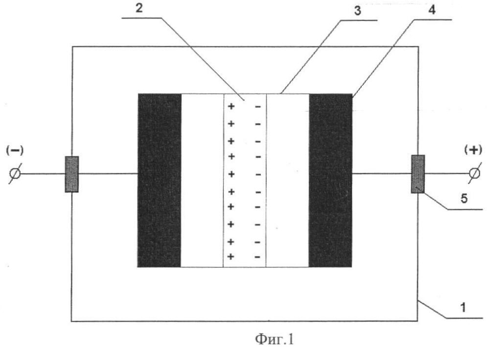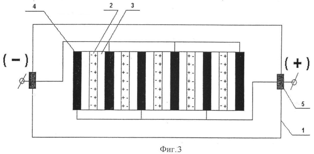 При наличии в пакете больше одной элементарной ячейки металлические пластины 4 чередуются таким образом, что каждая последующая элементарная ячейка располагается по отношению к предыдущей, прилегая одноименными зарядами металлической пластины 4 (см. фиг.2). Технологически предусмотрена замена двух прилегающих одноименных металлических пластин 4 одной общей пластиной (см. фиг.3).