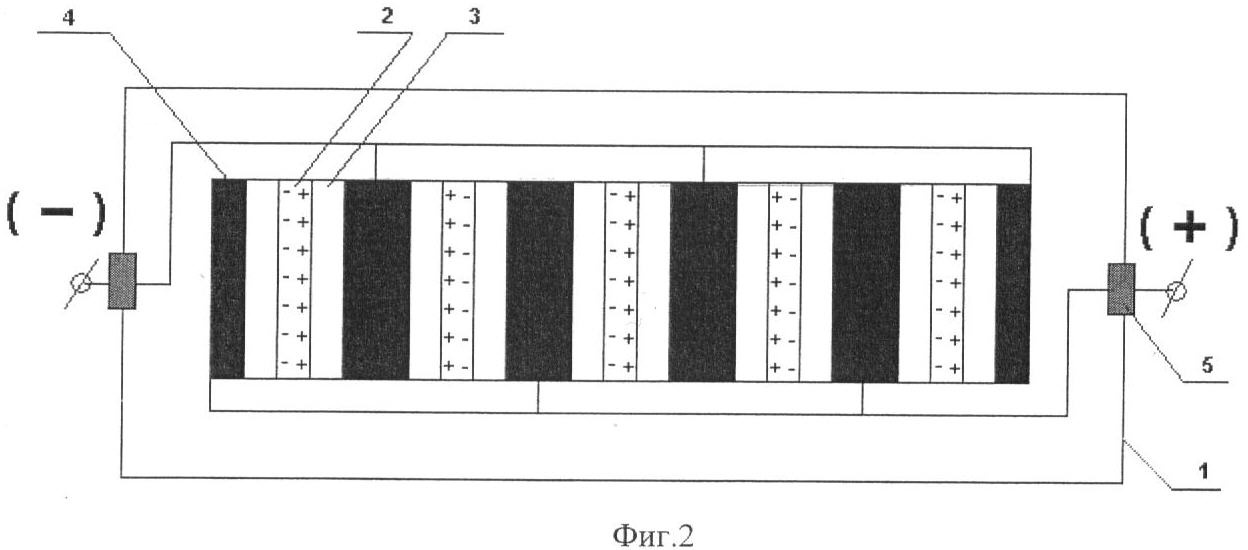 На фиг.2 представлен пакет устройства для получения электрической энергии, состоящий из пяти элементарных ячеек, при этом каждая последующая элементарная ячейка размещается по отношению к предыдущей, прилегая одноименными зарядами металлических пластин.