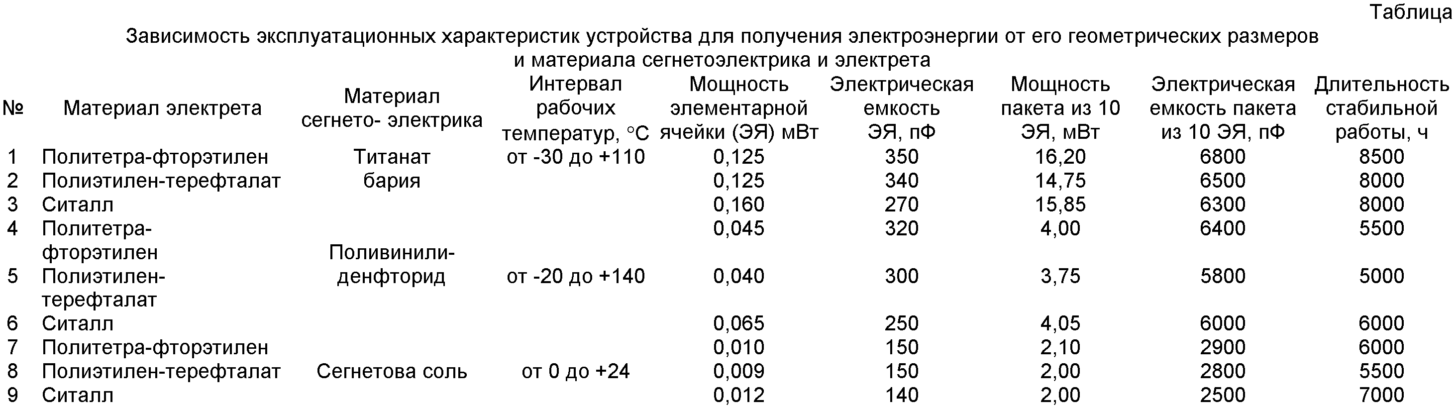 Примеры зависимости эксплуатационных характеристик устройства для получения электрической энергии от его геометрических размеров и материала электрета и сегнетоэлектрика приведены в таблице.
