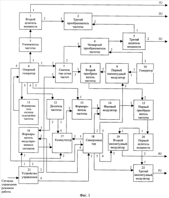 В первом преобразователе частоты 15 происходит формирование сигнала F0=Fг1(имп)+Fпр1 из сигналов Fпp1 и Fг1(имп), поступающих, соответственно, на первый и второй входы с выхода фазового модулятора 14 и выхода второго преобразователя частоты 8. Сигнал F0 с выхода первого преобразователя частоты 15 поступает на вход первого делителя мощности 20.