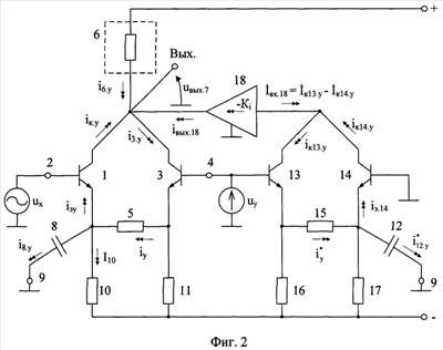 Поэтому в схеме фиг.2 при медленных изменениях uу реализуется высокий уровень подавления сигнала управления uу, что является одним из необходимых условий построения на ее основе высококачественных управляемых усилителей, модуляторов, аналоговых перемножителей и т.п.