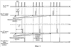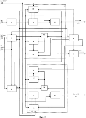 На схемах обозначено: 1 – формирователь импульсов (ФИ); 2 – основной делитель частоты; 3 – вспомогательный делитель частоты; 4 – блок управления; 5, 6, 7 – коммутаторы; 8 – первый счетчик импульсов основного делителя частоты; 9 – второй счетчик импульсов основного делителя частоты; 10 – блок буферной памяти основного делителя частоты; 11 – блок привязки к опорной частоте основной ШВ; 12 – триггер управления основного делителя частоты; 13 – блок остановки счета и предварительной установки декад основного делителя частоты; 14 – первый счетчик импульсов вспомогательного делителя частоты; 15 – второй счетчик импульсов вспомогательного делителя частоты; 16 – блок буферной памяти вспомогательного делителя частоты; 17 – блок привязки к опорной частоте вспомогательной ШВ; 18 – триггер управления вспомогательного делителя частоты; 19 – блок остановки счета и предварительной установки декад вспомогательного делителя частоты.
