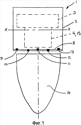 Априорная конфигурация выступания приблизительно на 3 мм и 1 мм за поверхность 54 соответственно для излучателей и приемников создает очень благоприятную форму языка зоны обнаружения. Общая форма языка созданной зоны 14 обнаружения показана на фиг. 3B (которая соответствует конфигурации по фиг. 3A) штрихпунктирной линией 55 периметра, указывающей внешнюю границу зоны 14. Будет небольшое отклонение формы, а также суммарной протяженности имеющей форму языка зоны 14 от выпускного отверстия 8 в направлении Z (смотрите направление Z на фиг. 2), из условия чтобы она изменялась между приблизительно 25 см и приблизительно 50 см, на основании применения изменяющейся мощности к излучателям, между 0,001 мА·с и 0,1 мА·с в установившемся режиме. Глубина показанной зоны 14 обнаружения согласно размеру C по фиг. 2, однако, будет мало изменяться, даже в то время как протяженность зоны 14 изменяется в направлении Z, когда изменяется мощность. Она остается относительно постоянной для компоновки чувствительных элементов в показанном примере, приблизительно на 8 см.