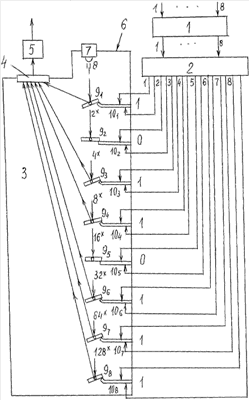 Функциональная схема ЦАП на Фиг.1 включает регистр 1, блок 2 импульсных усилителей, которых по числу разрядов в регистре восемь, пьезоэлектрический преобразователь 3 /ПП/, фотоприемник 4 и операционный усилитель 5. Регистр 1 восьмиразрядный. ПП 3 содержит непрозрачный корпус 6, в котором расположен микросветодиод 7 белого свечения с микролинзой 8 на излучающей стороне, последовательно расположенные друг за другом и по оптической оси микролинзы 8 с первого по восьмой полупрозрачные микрозеркала 91-8, и по числу их включает с первого по восьмой микропьезоэлементы 101-8, первые торцы которых жестко закреплены в корпусе 6, вторые свободные торцы микропьезоэлементов соответствующим образом соединены со своими микрозеркалами 91-8. В выходном отверстии корпуса 6 расположен фотоприемник 4 входным зрачком в сторону отражаемых от микрозеркал излучений. Микрозеркала 9 каждое площадью до 100 микрометров [2 с. 27, 30; 3 c.531] имеют светоделительное покрытие, выполняющее отношение отраженного излучения к пропущенному 1:0,5 [4 c. 223]. Стенки корпуса 6 имеют светопоглощающее покрытие. Излучение микросветодиода 1 фокусируется микролинзой 8 и поступает на первое микрозеркало 91 и последующие микрозеркала 92-8. Принцип действия пьезопреобразователя 3 основан на том, что каждое последовательно расположенное микрозеркало 9 пропускает на следующее за ним поток излучения, ослабленный в два раза, что соответствует принципу двоичного кода. В отсутствие управляющих сигналов на входах пьезоэлементов 10 микрозеркала 91-8 находятся в первом положении: излучение микросветодиода 7 при этом проходит сквозь все микрозеркала 91-8 и гасится до уровня ниже предела чувствительности фотоприемника 4. Выполняя порядок двоичного кода, каждое микрозеркало 9 ослабляет проходящее излучение в два раза: после первого микрозеркала в два раза, после второго в четыре раза после седьмого в 128 раз. С поступлением на микропьезоэлемент 10 управляющего импульса с блока 2 по амплитуде соответствующего напряжению срабатывания микропьезоэлемента 10, свободный торец микропьезоэлемента совершает изгиб и выполняет поворот микрозеркала 9 на угол, соответствующий попаданию отраженного излучения с микрозеркала 9 во входное окно фотоприемника 4. В качестве микропьезоэлементов применяются трубчатые пьезоэлементы, работающие на изгиб, достоинство которых – прочность и надежность [5 с.27]. Один торец микропьезоэлементов 10 жестко закреплен в корпусе 6, при изгибе свободный торец переводит свое микрозеркало 9 во второе положение, при котором отраженное от микрозеркала излучение поступает во входное окно фотоприемника 4, а 50% излучения проходит сквозь микрозеркало на следующее за ним.