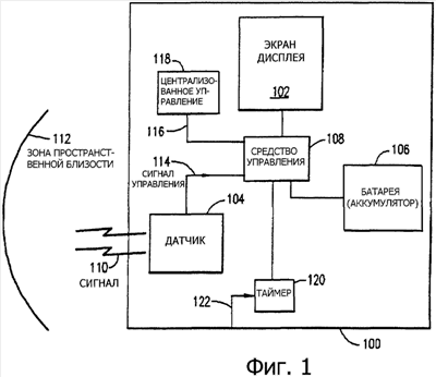 На Фиг.1 изображена блок-схема, иллюстрирующая устройство, согласно варианту осуществления настоящего изобретения. Как показано, устройство 100 связи, содержащее экран 102 дисплея, включает в себя датчик 104. Несмотря на то, что датчик 104 в этом конкретном варианте осуществления является датчиком пространственной близости, могут быть использованы и другие датчики (то есть, датчики давления, датчики температуры, датчики исходящей речи, светочувствительные датчики и т.д.). Источник питания в виде батареи 106 обеспечивается в пределах устройства 100 связи для приведения в действие экрана 102 дисплея через средство 108 управления. Средство 108 управления соединено с датчиком 104 и реагирует на сигналы, сформированные в нем. Датчик 104, здесь датчик пространственной близости, выполнен с возможностью обработки сигнала 110, приводящего в готовность датчик 104, когда объект находится в пределах зоны 112 пространственной близости, и для генерации соответствующего сигнала 114 управления. Сигнал 114 управления поставляется средству 108 управления для выборочного выключения питания экрана 102 дисплея или переключения иным способом устройства 100 связи в энергосберегающий режим.