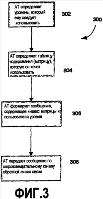 На этапе 306 процессор 270 выполняет логику построения сообщения для формирования сообщения, которое имеет часть индекса матрицы (например, 6 битов) и часть ранга (например, 2 бита для 4×4 MIMO). Часть индекса матрицы используется для того, чтобы предоставить индекс матрицы, ассоциативно связанный с выбранной матрицей. Часть ранга используется для того, чтобы предоставить значение ранга предпочтительное для использования посредством АТ. В зависимости от развернутой системы, если используется низкое значение ранга, то индексы для матриц, ассоциативно связанных с низким значением ранга будут такими, что используются не все из 6 битов части индекса матрицы. Например, это может быть достигнуто посредством индексирования матриц предварительного кодирования, так, что выбранная группа матриц будет занимать только 3 бита части индекса матрицы для уровня 1. Что означает, что для уровня 1 диапазон индексов матриц составляет 0 – 2**3 – 1. Если развернута система этого типа, то АР 100 будет в первую очередь определять значение ранга и обрабатывать только те биты, которые требуются для определения индекса матрицы предварительного кодирования. На этапе 308 процессор 270 выполняет логику передачи для передачи сообщения, построенного на этапе 306, по обратной линии связи.