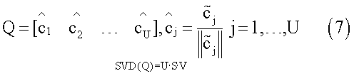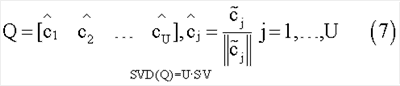 Другой подход, который может использоваться для комбинирования различных оценок вектора калибровки, может быть основан на комбинировании оцениваемых векторов в матрице. Например, в определенных аспектах, может быть так, что каждая оценка вектора калибровки является повернутой и масштабируемой версией того же самого вектора , и поворот и масштабирование возникают из-за различных рассогласований u терминала доступа. Одним способом избавиться от этого масштабирования и поворота является первоначальная нормализация каждого вектора калибровки, чтобы иметь единичную норму. Затем матрица Q, столбцы которой являются нормализованными оценками вектора калибровки, может формироваться из векторов калибровки. Единственная оценка для вектора калибровки получается с помощью выполнения декомпозиции матрицы, например, декомпозиция по сингулярным значениям матрицы Q. Собственный вектор, соответствующий максимальному сингулярному значению, может использоваться как общая оценка вектора калибровки, например, как показано в уравнении (7) ниже.