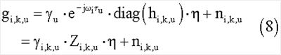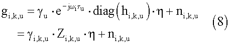 Альтернативой вычислению множества векторов калибровки является использование процедуры совместной оптимизации, использующей множество точек доступа и измерений доступа следующим образом. В некоторых случаях терминал доступа и точка доступа могут формировать свои оценки канала для различных частотных тонов и в различные моменты времени. Дополнительно, может быть ошибка k,u синхронизации между точкой доступа и u-м терминалом доступа в момент времени k. В таком случае оценка gi,k,u вектора канала прямой линии связи, измеряемая в терминале доступа, может быть связана с оценкой hi,k,u вектора канала обратной линии связи, измеряемой в точке доступа. Один подход, который использует вектор калибровки и рассогласование u для терминала доступа, отображен в уравнении 8 ниже.