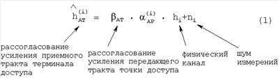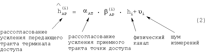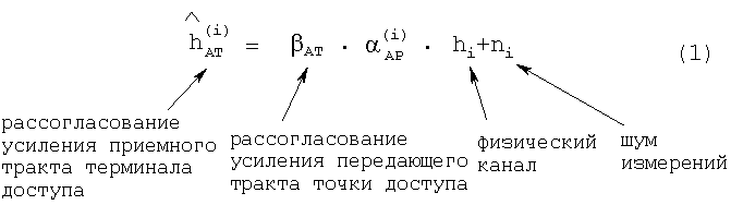 В уравнении 1 оценка канала является функцией рассогласования AT усиления тракта приемника терминала доступа, рассогласования усиления тракта передатчика точки доступа, физического канала hi между двумя измеряемыми антеннами и шум ni канала, который является частью оценки канала.