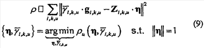 В уравнении (8) Zi,k,u является диагональной матрицей, диагональные элементы которой являются элементами оценки hi,k,u вектора канала обратной линии связи и Нижние индексы i, k, u являются индексами тона, времени и пользователя соответственно. В вышеупомянутом уравнении неизвестными являются вектор калибровки и конкретное рассогласование i,k,u терминала доступа. Особенностью уравнения 8 является то, что рассогласование терминала доступа включает в себя эффект рассогласования синхронизации между точкой доступа и терминалом доступа в дополнение к рассогласованию усилений, обусловленному трактами передачи и приема терминала доступа. Одним способом, чтобы получить решение для и i,k,u, является использование подхода минимальной среднеквадратической ошибки (MMSE), как показано в уравнении 9.