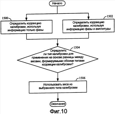 Фиг.10 иллюстрирует аспекты методологии для определения типа калибровки для применения. Веса калибровки определяются для подходов, которые выполняются, используя только информацию о рассогласовании фазы, блок 1500, и используя информацию о рассогласовании фазы и амплитуды, блок 1502. Только фазовая информация может включать в себя только фазу векторов калибровки, оценки канала или тому подобное для вычисления весов калибровки. Фазовая и амплитудная информация может включать в себя фазовую и амплитудную информацию векторов калибровки, оценки канала или тому подобное для вычисления весов калибровки. Веса калибровки могут вычисляться на основе информации от множества терминалов доступа, как описано в отношении фиг.6 и 7. Альтернативно они могут вычисляться из информация для единственного терминала доступа.