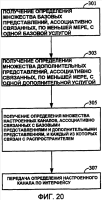 При работе, ссылаясь на фиг. 20 несколько аспектов способа настройки канала содержат получение определения множества базовых представлений, ассоциативно связанных, по меньшей мере, с одной базовой услугой (этап 301). Например, в некоторых аспектах MDS 12 получает атрибуты 20 услуги, к примеру, от поставщика содержимого или из локальной базы данных, которые задают каждую базовую услугу 16 и каждое базовое представление 42 с базовой услугой. Помимо этого, например, информация 20 атрибутов услуги может быть задана в рамках информации 68 услуги (фиг. 3) SI-сообщения 44, и как идентифицировано для каждой записи 185 услуги (фиг. 9), как указано ссылкой посредством каждой записи 173 базовой услуги (фиг. 7) каждой записи 91 канала (фиг. 7). Дополнительно, например, в некоторых аспектах MDS 12 может принимать мультимедийные сегменты 14, которые задают одно или более представлений 42, которые формируют часть базовой услуги 16 от одного или более поставщиков 18 содержимого. Это содержимое может быть сохранено в одном или более серверов 60 содержимого, как в случае передаваемого не в реальном времени содержимого, и/или может быть передано посредством сети, ассоциативно связанной с MDS 12, как в случае содержимого, представляемого в реальном времени. Альтернативно, MDS 12 может принимать ссылку на позицию, из которой представление может быть извлечено и/или из которой представление может быть перенаправлено в другое назначение.