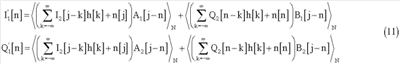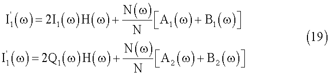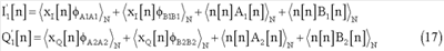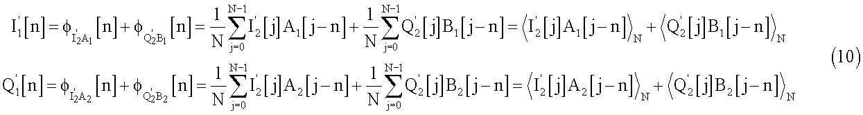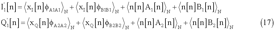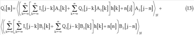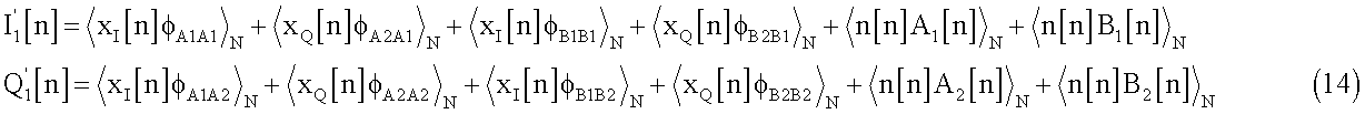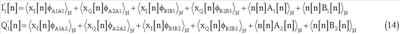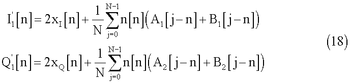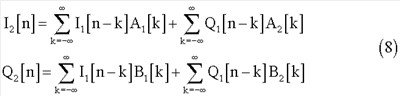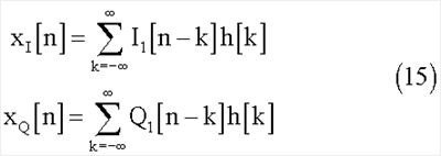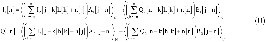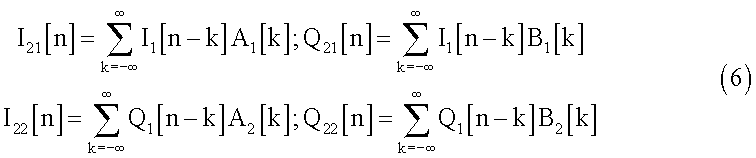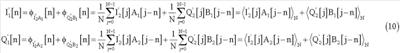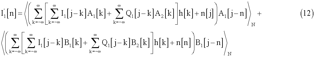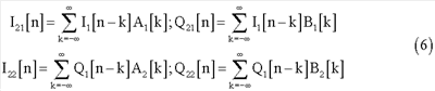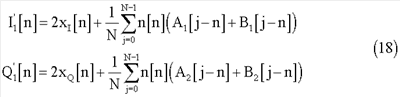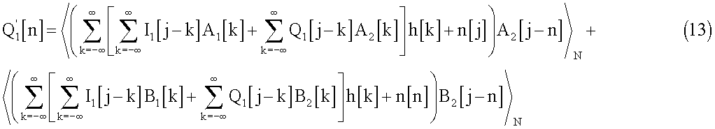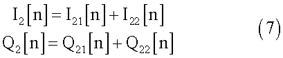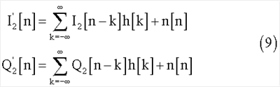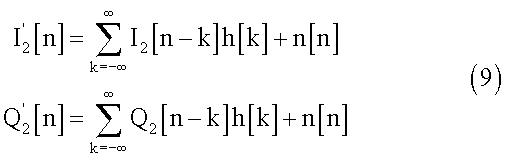Полученные сигналы I2[n] и Q2[n] будут модулированы и переданы через средства h[n] и достигнут приемника вместе с добавочным шумом. Поэтому, после демодуляции, при приеме полученные сигналы будут выглядеть следующим образом:
